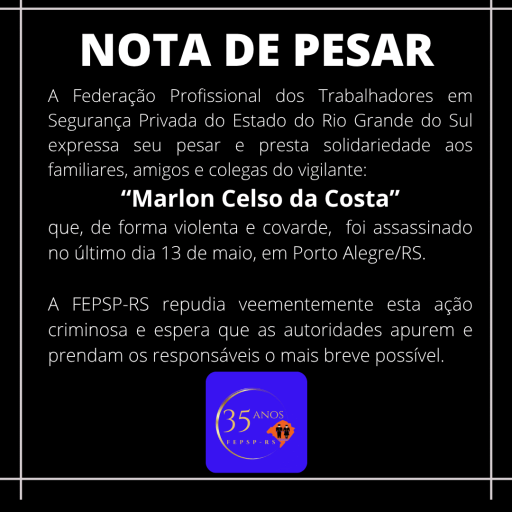 É com pesar que emitimos esta nota em solidariedade à família, amigos e colega do vigilante Marlon Celso da Costa, que de forma violenta e covarde foi assassinado no último dia 13/05, em Porto Alegre/RS.